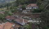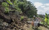 REPUBLIKA.CO.ID, TASIKMALAYA -- Warga berjalan melintasi material tanah longsor yang menimbun jalan dan rumah di Desa Banyurasa, Kabupaten Tasikmalaya, Jawa Barat, Kamis (4/5/2023).