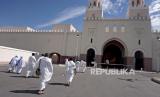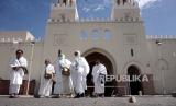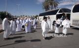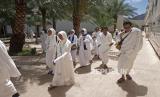 Jamaah Umroh Abhinaya Tour & Travel bersiap menuju bus seusai melakukan miqat umroh di Masjid Bir Ali, Madinah, Arab Saudi, Kamis (4/5/2023). (FOTO : Republika/Prayogi)