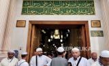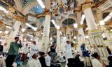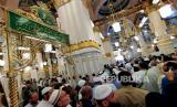 Umat muslim berada di pintu keuar usai berziarah ke makam Nabi Muhammad SAW dan dua sahabatnya Abu Bakar dan Umar bin Khattab di Masjid Nabawi, Madinah, Arab Saudi, Kamis (4/5/2023). Raudhah dan makam Nabi Muhammad SAW yang berada di kawasan Masjid Nabawi tersebut menjadi salah satu tujuan umat Islam saat berkunjung ke Kota Madinah. Tempat tersebut menjadi area favorit para jamaah untuk melakukan amalan ibadah kepada Allah SWT yang diyakini menjadi tempat mustajab berdoa. Saat ini untuk masuk ke Raudhah diperlukan tasreh (izin masuk) yang dapat dapat diajukan secara mandiri melalui platform Nusuk, sebuah aplikasi yang disediakan Kerajaan Arab Saudi. (FOTO : Republika/Prayogi)
