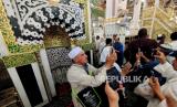 Umat muslim mengantre untuk berziarah ke makam Nabi Muhammad SAW dan dua sahabatnya Abu Bakar dan Umar bin Khattab di Masjid Nabawi, Madinah, Arab Saudi, Kamis (4/5/2023). Raudhah dan makam Nabi Muhammad SAW yang berada di kawasan Masjid Nabawi tersebut menjadi salah satu tujuan umat Islam saat berkunjung ke Kota Madinah. Tempat tersebut menjadi area favorit para jamaah untuk melakukan amalan ibadah kepada Allah SWT yang diyakini menjadi tempat mustajab berdoa. Saat ini untuk masuk ke Raudhah diperlukan tasreh (izin masuk) yang dapat dapat diajukan secara mandiri melalui platform Nusuk, sebuah aplikasi yang disediakan Kerajaan Arab Saudi. (FOTO : Republika/Prayogi)