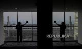 REPUBLIKA.CO.ID,BANDUNG -- Pekerja membersihkan kaca di salah satu sudut ruangan di hotel De Braga by Artotel, Jalan Braga, Sumur Bandung, Kota Bandung, Jawa Barat, Jumat (5/5/2023).