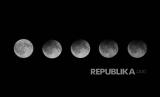 Foto komposit (memotret beberapa kondisi lighting pada objek untuk digabungkan menjadi satu foto akhir) menunjukkan (dari kiri) bulan purnama selama gerhana bulan penumbra (mulai gerhana maksimum) di Taipei, Taiwan, (6/5/ 2023). (FOTO : EPA-EFE/RITCHIE B. TONGO)