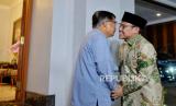 Wakil Presiden Republik Indonesia ke 10 dan 12 Jusuf Kalla (kiri) menyambut kedatangan Ketua Umum Partai Kebangkitan Bangsa (PKB) Muhaimin Iskandar (kanan) saat melakukan pertemuan di kediaman pribadi Jusuf Kalla di Jakarta, Sabtu (6/5/2023). (FOTO : Republika/Thoudy Badai)