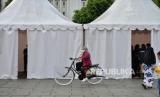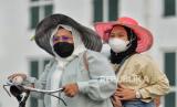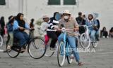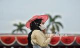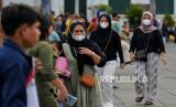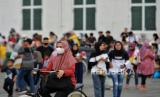 Pengunjung memakai masker saat berwisata di Kawasan Kota Tua, Jakarta, Sabtu (6/5/2023). (FOTO : Republika/Thoudy Badai)