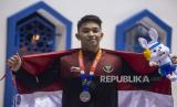 Perenang Indonesia Farrel Armandio Tangkas menunjukan medali perak seusai penyematan medali pada nomor 100m gaya punggung putra saat SEA Games 2023 di Aquatics Center, Morodok Techno National Stadium, Kamboja, Sabtu (6/5/2023). Farrel meraih medali perak usai finis kedua dengan catatan waktu 55,80 detik sementara perenang Singapura Zheng Wen Quah meraih medali emas dengan catatan waktu 55,22 detik dan perenang Filipina Jerard Dominic Jacinto meraih medali perunggu dengan catatan waktu 55,99. (FOTO : ANTARA FOTO/M Agung Rajasa)
