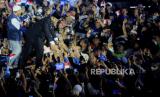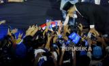Bakal Calon Presiden dari Koalisi Perubahan untuk Persatuan (KPP) Anies Baswedan (tengah) melambaikan tangan kepada relawan sebelum menyampaikan pidato politik di Tenis Indoor Senayan, Kompleks Gelora Bung Karno, Jakarta, Ahad (7/5/2023). Anies Baswedan menyampaikan pidato bertajuk Meluruskan Jalan Menghadirkan Keadilan yang dihadiri 4.000 relawan. Pada kesempatan tersebut juga dideklarasikan relawan Amanat Indonesia (Anies) yang merupakan komunitas gerakan yang memperjuangkan Anies sebagai Presiden 2024. (FOTO : Republika/Putra M. Akbar)