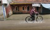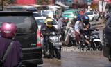Pengendara melintasi jalan yang telah ditinggikan, di daerah Dayeuhkolot, Kabupaten Bandung, Ahad (7/5/2023). (FOTO : Edi Yusuf/Republika)