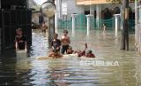 Sejumlah anak bermain di jalan yang terendam banjir di daerah Bojongsoang, Kabupaten Bandung, Ahad (7/5/2023). (FOTO : Edi Yusuf/Republika)