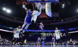 Tobias Harris dari Philadelphia 76ers (kiri) mencoba melakukan Slam Dunk yang dihalangi Marcus Smart dari Boston Celtics saat babak kedua Game 4 dalam seri playoff semifinal NBA Wilayah Timur, Ahad, (7/5/2023), di Philadelphia. (FOTO : AP/Matt Slocum)