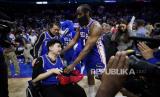 REPUBLIKA.CO.ID, PHILADELPHIA -- James Harden dari Philadelphia 76ers memberikan sepatunya kepada John Hao setelah Game 4 dalam seri playoff semifinal NBA Wilayah Timur, Ahad, (7/5/2023) di Philadelphia.