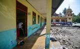 Siswa madrasah tersebut terpaksa melaksanakan ujian di halaman karena kelas mereka masih terendam lumpur akibat banjir pada Ahad (7/5/2023).
