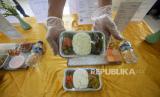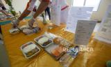 REPUBLIKA.CO.ID,BATAM -- Koki memperlihatkan contoh paket makanan untuk jamaah calon haji selama dalam penerbangan di Gedung Pusat Informasi Haji (PIH) Batam, Kepulauan Riau, Senin (8/5/2023).