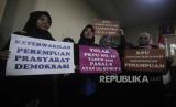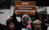 Sejumlah peserta aksi memegang poster terkait penolakan terhadap Peraturan Komisi Pemilihan Umum (PKPU) Nomor 10 Pasal 8 di Jakarta, Senin (8/4/2023). Aksi gabungan dari kelompok Masyarakat Peduli Keterwakilan Perempuan PKPU Nomor 10 Pasal 8 Ayat (2) mengenai perhitungan bakal calon perempuan di setiap dapil. Mereka menuntut untuk mengubah ketentuan pembulatan ke bawah pada aturan teknis implementasi kuota 30 persen bakal calon legislatif perempuan. Pasal tersebut dinilai bermasalah karena dapat mematikan upaya peningkatan keterwakilan perempuan dan pencalonan DPR serta DPRD. (FOTO : Republika/Putra M. Akbar)