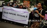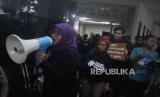 Sejumlah peserta aksi melakukan orasi terkait penolakan terhadap Peraturan Komisi Pemilihan Umum (PKPU) Nomor 10 Pasal 8 di Jakarta, Senin (8/4/2023). Aksi gabungan dari kelompok Masyarakat Peduli Keterwakilan Perempuan PKPU Nomor 10 Pasal 8 Ayat (2) mengenai perhitungan bakal calon perempuan di setiap dapil. Mereka menuntut untuk mengubah ketentuan pembulatan ke bawah pada aturan teknis implementasi kuota 30 persen bakal calon legislatif perempuan. Pasal tersebut dinilai bermasalah karena dapat mematikan upaya peningkatan keterwakilan perempuan dan pencalonan DPR serta DPRD. (FOTO : Republika/Putra M. Akbar)