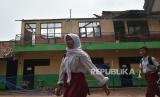 Sejumlah murid sekolah melintas disamping ruang kelas SDN Sukadanau 01 yang ambruk di Cikarang Barat, Kabupaten Bekasi, Jawa Barat, Selasa (9/5/2023). (FOTO : ANTARA FOTO/Fakhri Hermansyah)