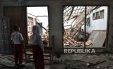 Sejumlah murid sekolah mengamati ruang kelas SDN Sukadanau 01 yang ambruk di Cikarang Barat, Kabupaten Bekasi, Jawa Barat, Selasa (9/5/2023). (FOTO : ANTARA FOTO/Fakhri Hermansyah)