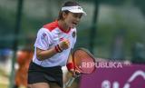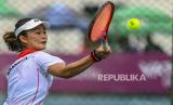 Petenis tunggal putri Indonesia Priska Madelyn Nugroho mengembalikan bola ke arah petenis Thailand Lanlana Tararudee pada pertandingan final tenis beregu putri SEA Games 2023 di Tennis Arena, Morodoc Techo National Stadium, Phnom Penh, Kamboja, Selasa (9/5/2023). (FOTO : ANTARA FOTO/Muhammad Adimaja)