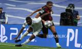 Bek Real Madrid Antonio Rudiger (Kiri) berebut bola dengan pemain Manchester City Manuel Akanji (Kanan) saat pertandingan sepak bola leg pertama semifinal Liga Champions UEFA antara Real Madrid dan Manchester City, di Madrid, Spanyol, Rabu (10/5/2023) dini hari WIB. (FOTO : EPA-EFE/Kiko Huesca)