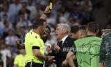 Wasit Artur Dias (kiri) memberikan kartu kuning kepada pelatih kepala Real Madrid Carlos Ancelotti (kanan) saat pertandingan sepak bola leg pertama semifinal Liga Champions UEFA antara Real Madrid dan Manchester City, di Madrid, Spanyol, Rabu (10/5/2023) dini hari WIB. (FOTO : EPA-EFE /JuanJo Martin)