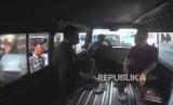Sopir angkot 44 jurusan Tebet-Tanah Abang membuka pintu kendaraannya saat aksi mogok di Halte Integrasi Tebet, Jakarta, Rabu (10/5/2023). (FOTO : Republika/Putra M. Akbar)
