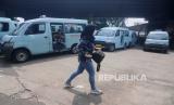Sopir angkot 44 jurusan Tebet-Tanah Abang berjalan saat melakukan aksi mogok di Halte Integrasi Tebet, Jakarta, Rabu (10/5/2023). (FOTO : Republika/Putra M. Akbar)