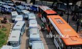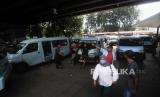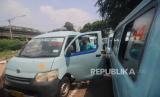 Sopir angkot 44 jurusan Tebet-Tanah Abang duduk di dalam kendaraannya saat melakukan aksi mogok di Halte Integrasi Tebet, Jakarta, Rabu (10/5/2023). (FOTO : Republika/Putra M. Akbar)
