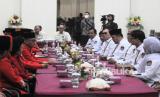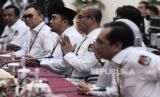 Sekjen PDI Perjuangan Hasto Kristyanto (ketiga kiri) berbincang dengan Ketua KPU Hasyim Asyari (ketiga kanan) saat pendaftaran bakal calon legoslatif di Kantor KPU, Jakarta, Kamis (11/5/2023). (FOTO : Republika/Putra M. Akbar)