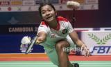 REPUBLIKA.CO.ID, KAMBOJA. -- Pebulu tangkis tunggal putri Indonesia Ester Nurumi Tri Wardoyo mengembalikan kok ke arah lawannya pebulu tangkis tunggal putri Thailand Supanida Katethong pada pertandingan babak final bulu tangkis beregu putri SEA Games 2023 di Badminton Hall, Morodoc Techo National Stadium, Phnom Penh, Kamboja, Kamis (11/5/2023).
