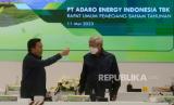 Presiden Direktur PT Adaro Energy Indonesia Tbk (Adaro) Garibaldi Thohir (tiga kiri bawah) berbincang dengan Presiden Komisaris Adaro Edwin Soeryadjaya (empat kanan bawah) serta jajaran direksi dan komisaris usai melaksanakan Rapat Umum Pemegang Saham Tahunan (RUPST) di Jakarta, Kamis (11/5/2023). RUPST kali ini menyetujui dan mengesahkan antara lain laporan tahunan dan laporan keuangan konsolidasi ADRO tahun 2022. Adaro terus berfokus pada efisiensi dan keunggulan operasional serta meningkatkan kontribusi bagi Indonesia diantaranya dalam bentuk pajak dan royalti. Pada tahun FY22, royalti dan pajak penghasilan badan yang dibayarkan kepada Pemerintah Indonesia mencapai $2.876 juta atau 222% lebih tinggi daripada $893 juta pada FY21. (FOTO : Prayogi/Republika)