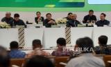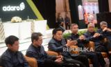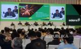 Presiden Direktur PT Adaro Energy Indonesia Tbk (Adaro) Garibaldi Thohir bersama jajaran direksi memberikan keterangan pers usai melaksanakan Rapat Umum Pemegang Saham Tahunan (RUPST) di Jakarta, Kamis (11/5/2023). RUPST kali ini menyetujui dan mengesahkan antara lain laporan tahunan dan laporan keuangan konsolidasi ADRO tahun 2022. Adaro terus berfokus pada efisiensi dan keunggulan operasional serta meningkatkan kontribusi bagi Indonesia diantaranya dalam bentuk pajak dan royalti. Pada tahun FY22, royalti dan pajak penghasilan badan yang dibayarkan kepada Pemerintah Indonesia mencapai $2.876 juta atau 222% lebih tinggi daripada $893 juta pada FY21. (FOTO : Prayogi/Republika)