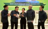 Presiden Direktur PT Adaro Energy Indonesia Tbk (Adaro) Garibaldi Thohir (tengah) saat memimpin Rapat Umum Pemegang Saham Tahunan (RUPST) di Jakarta, Kamis (11/5/2023). RUPST kali ini menyetujui dan mengesahkan antara lain laporan tahunan dan laporan keuangan konsolidasi ADRO tahun 2022. Adaro terus berfokus pada efisiensi dan keunggulan operasional serta meningkatkan kontribusi bagi Indonesia diantaranya dalam bentuk pajak dan royalti. Pada tahun FY22, royalti dan pajak penghasilan badan yang dibayarkan kepada Pemerintah Indonesia mencapai $2.876 juta atau 222% lebih tinggi daripada $893 juta pada FY21. (FOTO : Prayogi/Republika)
