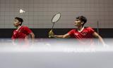 Pebulu tangkis ganda putra Indonesia Muhammad Shohibul Fikri (kanan) dan Bagas Maulana (kiri) mengembalikan kok ke arah lawannya pebulu tangkis Malaysia Beh Chun Meng dan Goh Boon Zhe pada final bulu tangkis beregu putra SEA Games 2023 di Badminton Hall, Morodoc Techo National Stadium, Phnom Penh, Kamboja, Kamis (11/5/2023). Tim bulu tangkis beregu putra Indonesia berhasi meraih medali emas setelah mengalahkan Malaysia dengan skor 3-1. (FOTO : Antara/Muhammad Adimaja)