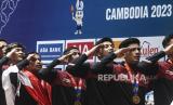 REPUBLIKA.CO.ID,PHNOM PENH -- Pebulu tangkis ganda putra Indonesia melakukan penghormatan bendera saat upacara penyerahan medali usai pertandingan final bulu tangkis beregu putra SEA Games 2023 melawan Malaysia di Badminton Hall, Morodoc Techo National Stadium, Phnom Penh, Kamboja, Kamis (11/5/2023).