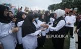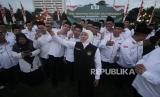 REPUBLIKA.CO.ID, SURABAYA -- Gubernur Jawa Timur Khofifah Indar Parawansa hadir saat apel kesiapan petugas haji Indonesia embarkasi Surabaya di halaman Gedung Negara Grahadi, Surabaya, Jawa Timur, Kamis (11/5/2023).