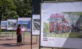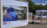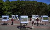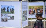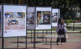 Pengunjung mengamati foto yang dipajang pada Pameran Foto Jurnalistik Nawasena di Taman Saparua, Kota Bandung, Jawa Barat, Jumat (12/5/2023). (FOTO : ABDAN SYAKURA/REPUBLIKA)