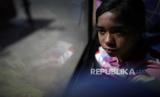 Seorang imigran Venezuela menangis dari bus yang akan membawanya ke Nikaragua untuk memasuki AS, di Paso Canoas, kota perbatasan antara Panama dan Kosta Rika, Panama, (11/5/2023). (FOTO : EFE/EPA Bienvenido Velasco)
