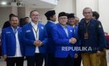Ketua Umum PAN Zulkifli Hasan berjabat tangan dengan Ketua KPU RI Hasyim Asy (FOTO : Republika/Prayogi)