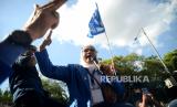 Pelawak Komar saat mengikuti penyerahan berkas pendaftaran bakal caleg PAN di Kantor KPU RI, Jakarta, Jumat (12/5/2023). Fenomena publik figur atau artis yang banting setir ke dunia politik ini pun sudah muncul sejak lama. Tak jarang, mereka pun memilih untuk meneruskan karier mereka di politik untuk maju menjadi calon legislatif (caleg) dibanding dunia hiburan. (FOTO : Republika/Prayogi)