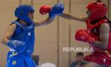 Atlet Wushu Indonesia Tharisa Dea Florentina (kanan) bertarung melawan atlet Wushu Kamboja Phatt Dany (kiri) dalam final Wushu nomor Sanda 52 kg putri saat SEA Games 2023 di Chroy Changvar International Convention & Exhibition Center, Phnom Penh, Kamboja, Jumat (12/5/2023). Tharisa berhasil memenangkan pertandingan dengan kemenangan mutlak dan meraih medali emas untuk nomor tersebut. (FOTO : Antara/M Agung Rajasa)