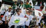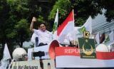 Simpatisan Partai Bulan Bintang Yusril Ihza Mahendra memeriahkan penyerahan berkas pendaftaran bakal calon legislatif di Kantor KPU, Jakarta, Sabtu (13/5/2023). Partai Bulan Bintang resmi mendaftarkan 580 bakal calon legislatif untuk DPR RI dan memenuhi syarat keterwakilan perempuan mencapai 40 persen pada Pemilu 2024. (FOTO : Republika/Putra M. Akbar)