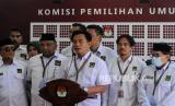 Ketua Umum Partai Bulan Bintang Yusril Ihza Mahendra (tengah) menyampaikan konferensi pers usai penyerahan berkas pendaftaran bakal calon legislatif di Kantor KPU, Jakarta, Sabtu (13/5/2023). Partai Bulan Bintang resmi mendaftarkan 580 bakal calon legislatif untuk DPR RI dan memenuhi syarat keterwakilan perempuan mencapai 40 persen pada Pemilu 2024. (FOTO : Republika/Putra M. Akbar)