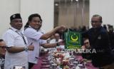 Ketua KPU Hasyim Asyari (kanan) bersama Ketua Umum Partai Bulan Bintang Yusril Ihza Mahendra (kedua kiri) saat penyerahan berkas pendaftaran bakal calon legislatif di Kantor KPU, Jakarta, Sabtu (13/5/2023). Partai Bulan Bintang resmi mendaftarkan 580 bakal calon legislatif untuk DPR RI dan memenuhi syarat keterwakilan perempuan mencapai 40 persen pada Pemilu 2024. (FOTO : Republika/Putra M. Akbar)