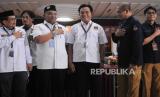 Ketua KPU Hasyim Asyari (kedua kana ) bersama Ketua Umum Partai Bulan Bintang Yusril Ihza Mahendra (tengah) bersiap foto bersama saat penyerahan berkas pendaftaran bakal calon legislatif di Kantor KPU, Jakarta, Sabtu (13/5/2023). Partai Bulan Bintang resmi mendaftarkan 580 bakal calon legislatif untuk DPR RI dan memenuhi syarat keterwakilan perempuan mencapai 40 persen pada Pemilu 2024. (FOTO : Republika/Putra M. Akbar)
