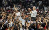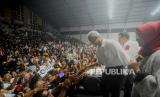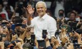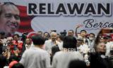 Bakal Calon Presiden dari PDI Perjuangan Ganjar Pranowo menyapa Relawan Jokowi saat Halal Bihalal di Jakarta, Sabtu (13/5/2023). Ganjar Pranowo menghadiri acara Halal Bihalal yang dihadiri 245 organisasi Relawan Jokowi yang nantinya bertranformasi mendukung Ganjar pada Pilpres 2024. (FOTO : Republika/Putra M. Akbar)