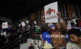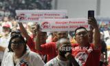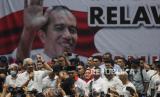 Sejumlah Relawan Jokowi bersiap menyambut kedatangan Bakal Calon Presiden dari PDI Perjuangan Ganjar Pranowo saat acara Halal Bihalal di Jakarta, Sabtu (13/5/2023). Ganjar Pranowo menghadiri acara Halal Bihalal yang dihadiri 245 organisasi Relawan Jokowi yang nantinya bertranformasi mendukung Ganjar pada Pilpres 2024. (FOTO : Republika/Putra M. Akbar)