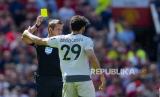 Wasit John Brooks (kiri) menunjukkan kartu kuning kepada pemain  Wolverhampton Diego Costa pada pertandingan sepak bola Liga Premier Inggris antara Manchester United dan Wolverhampton di stadion Old Trafford di Manchester, Inggris,Sabtu (13/5/2023).  (FOTO : AP Photo/Jon Super)