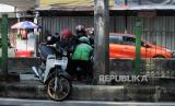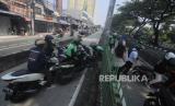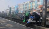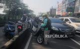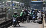 Pengendara motor yang melewati jalur Bus Transjakarta mengangkut kendaraanya untuk menghindari Polisi di kawasan Pasar Rumput, Manggarai, Jakarta Selatan, Senin (15/5/2023). Polisi kembali memberlakukan tilang manual karena sistem ETLE atau sistem tilang elektronik belum bisa menjangkau seluruh titik ruas jalan untuk memperhatikan setiap pelanggaran yang dilakukan pengendara, khususnya kendaraan bermotor. (FOTO : Republika/Putra M. Akbar)