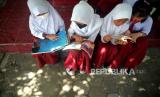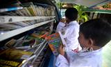 Siswa membaca buku bacaan dari mobil Perpustakaan Keliling Kota Yogyakarta saat kunjungan ke SDN 2 Keputran, Yogyakarta, Senin (15/5/2023). Setiap dua pekan perpustakaan keliling akan berkunjung ke sekolah dasar. Program ini untuk meningkatkan minat dan kebiasaan membaca siswa sekolah. Tidak hanya itu, petugas juga membantu dan mendampingi siswa-siswa yang membaca buku. (FOTO : Republika/Wihdan Hidayat)