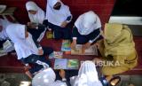 Petugas Perpustakaan Keliling Kota Yogyakarta mendampingi siswa saat kunjungan ke SDN 2 Keputran, Yogyakarta, Senin (15/5/2023). Setiap dua pekan perpustakaan keliling akan berkunjung ke sekolah dasar. Program ini untuk meningkatkan minat dan kebiasaan membaca siswa sekolah. Tidak hanya itu, petugas juga membantu dan mendampingi siswa-siswa yang membaca buku. (FOTO : Republika/Wihdan Hidayat)
