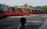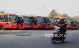 Sejumlah Bus Transjakarta yang rusak dan tidak terawat yang terparkir di Terminal Terpadu Pulo Gebang, Jakarta Timur, Senin (15/5/2023). (FOTO : Republika/Putra M. Akbar)